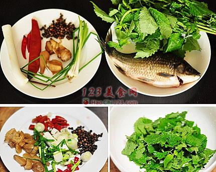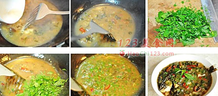 9、烧鱼的时候就切好剩下的一半藿香叶,最后倒入沸腾的汤汁拌匀,全部淋在盛出的鱼的表面即可食用。