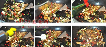 4、净锅重新倒油爆香泡辣椒、泡姜蒜、泡花椒和葱。