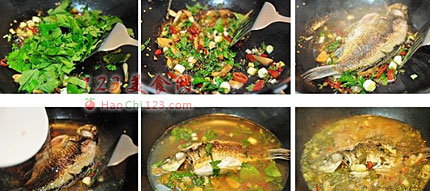 6、加入一半的藿香炒软,放入鲫鱼。