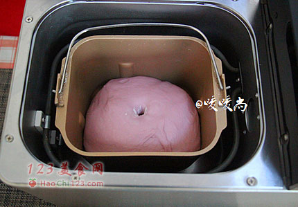 3、待面团揉至光滑后加入提前软化的黄油继续一个揉面程序,直至面团出膜。将揉好的面团略微整形后,启动发酵程序,至面团发到原来的2-2.5倍大,手指沾上面粉戳一下洞不回缩不塌陷。
