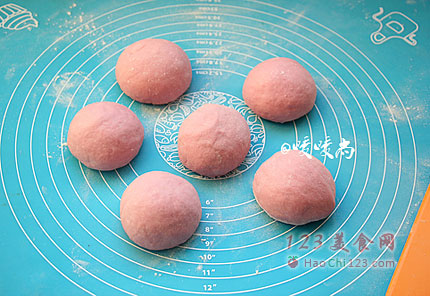 4、一发后的面团分割成均匀的6等份,揉匀团圆,盖上保鲜膜松弛15分钟。