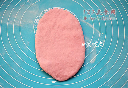 5、将松弛后的面包胚擀成如图椭圆形。