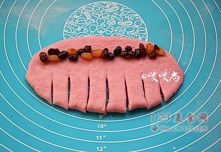 6、调转90度,在面皮下部1/2处用到切成如图的条状,然后在面皮上部码放上蜜豆。