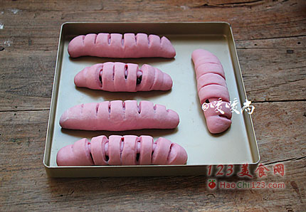 7、自上而下将面皮卷起。将卷好的面包胚均匀码放在烤盘中,放置温暖湿润处进行二发。