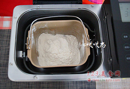 2、按照先液体后固体的顺序,将做面包所需的所有材料放进面包机的揉面桶中,注意盐糖不要直接和发酵粉接触,启动揉面程序。