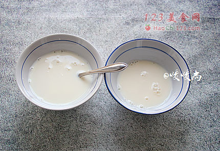 2、吉利丁片分成15g、10g两份,分别加冷水浸泡至吉利丁片变软。将浸泡吉利丁片的冷水篦干净,分别加入100g(简称A)、50g的牛奶(简称B),隔水加热至吉利丁片融化,常温放置待用。