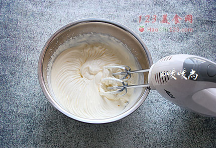 3、淡奶油提前冰箱冷藏,取一无油无水的干净容器,分三次加入30g的糖粉,打发至有纹路出现且不消退的状态即可。