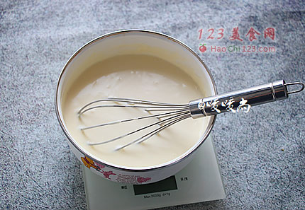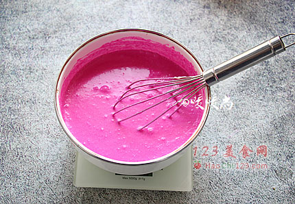 4、将步骤4的液体A倒入步骤2处理好的红心火龙果溶液中,搅拌均匀,然后放入3/5打发好的淡奶油,搅拌均匀后盛入带尖嘴的量杯中方便一会儿分装。