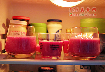 5、取5个干净无油的杯子,将火龙果慕斯糊分装在杯子中。将装好火龙果慕斯糊的杯子放进冰箱,冷藏2小时左右至慕斯液凝固定型。