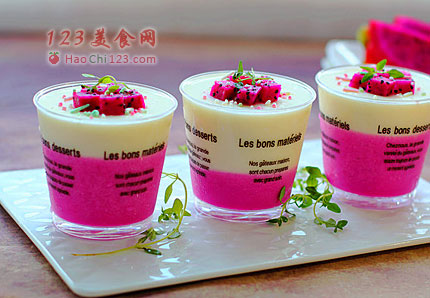 2、为了慕斯杯分层更明显,一定要等下层的火龙果慕斯完全凝固后再加酸奶和淡奶油做的慕斯糊。