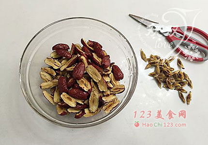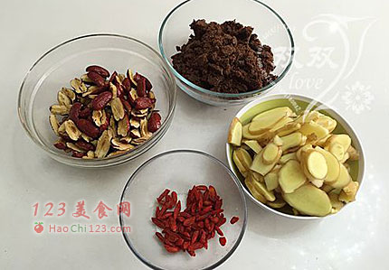 2、生姜切片,枸杞洗净(生姜不要去皮。有种说法是,喝姜汤发汗去皮;做姜枣膏驱寒取暖则不要去皮)。