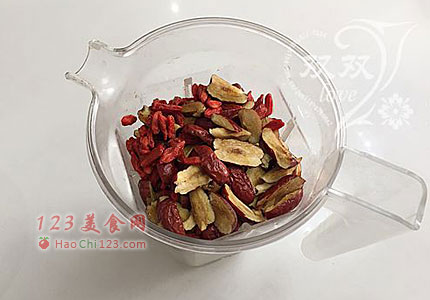 3、将姜片、大枣片、枸杞放入料理杯中,绞碎(如果搅拌杯不够大,可以分次绞,以防转不动,反而影响效果)。