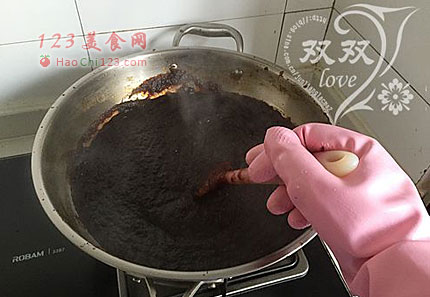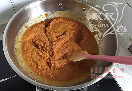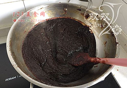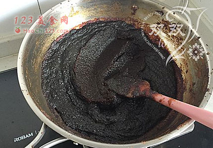 6、放入红糖。小火,中途不断搅拌(注意,熬煮过程会不断有气泡冒出,液体飞溅,带个手套,将手臂包起来,以防烫伤)。