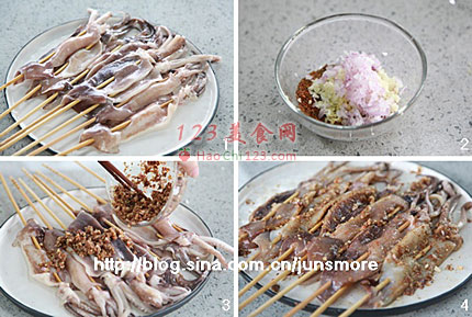 2、很多超市都可以买到已经穿好了竹签的鱿鱼串,买来直接就可以用,会更省事一些。当然,其实不穿竹签也完全没问题哈,将鱿鱼切成大小合适的块,直接腌好直接烙烤。