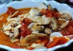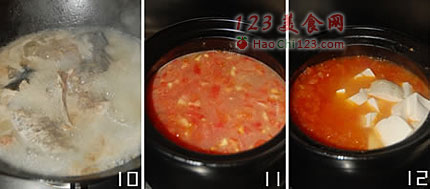 10、11、大火煮至汤汁发白后转入砂锅,加入蕃茄丁和适量水煮开转中火(锅内有大气泡翻腾,这样才能把蕃茄的营养煮进汤里)。