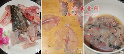 6、片好的鱼肉洗净,用料酒,盐,黑胡椒,蛋清,淀粉抓匀,腌制1小时以上(腌制时间太短,鱼肉不入味,不好吃,加了蛋清和淀粉,鱼片会变得嫩滑)。