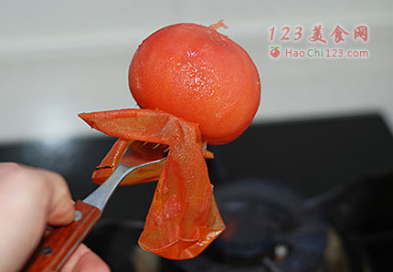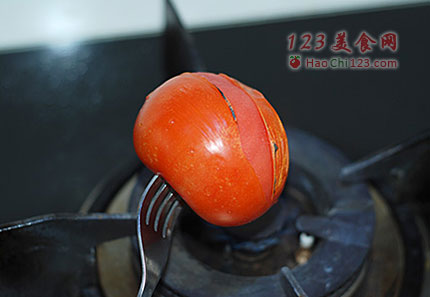 2、煤气灶开小火,将番茄放在火上来回的转动加热,不一会就会听到“扑哧”一声,番茄的皮因为加热自己爆开了。