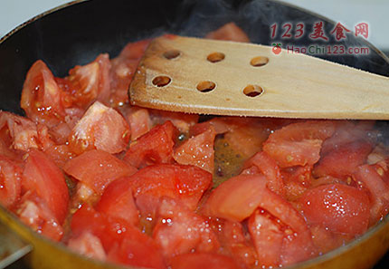 6、放入切碎的番茄丁中小火煸炒,期间不断的碾压搅拌,以免糊底。