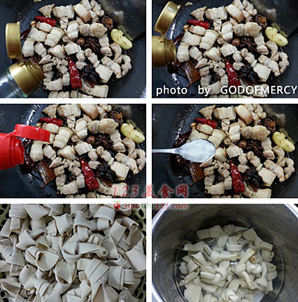 5、烧五花肉的诀窍,记得要放冰糖,可以给五花肉上色亮闪闪的(不过妈妈烧这道菜时,冰糖是五花肉和百叶结在一块时放入的,味道好特别哦)。