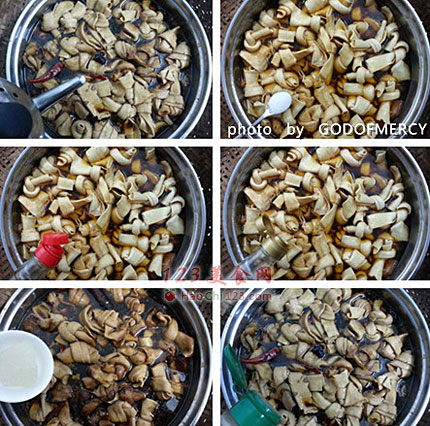 4、千张结在烧的过程中,要分两次加老抽,第一次上色;第二次入味。
