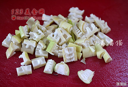 2、新鲜的春笋,看着就招人爱。一层层的剥掉春笋的外皮。享用春天的滋味除了需要耐心,还要舍得。笋切小块,和蚕豆大小差不多。