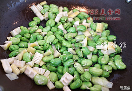 5、焯过水的笋丁和去皮蚕豆同时下锅翻炒3-4分钟,加入1勺黄酒烹炒。蚕豆要尽量炒熟,不然铭感的人吃了会不舒服。