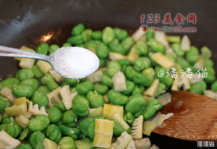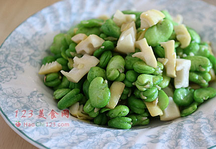 7、白绿相间的春笋炒蚕豆就做好了,鲜嫩。