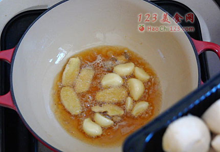 2、放入大蒜,姜片炒出香味。