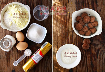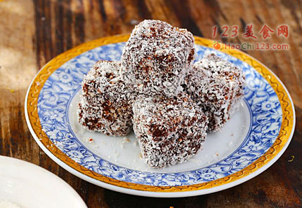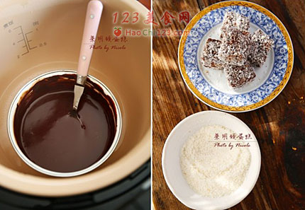 8、蛋糕快蘸满巧克力溶液,再粘一层椰蓉。