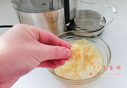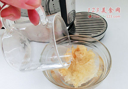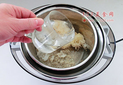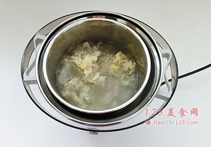 4、锅中放入与黑小米多10倍左右的开水,加入银耳。锅中加入的是开水,煮出的粥口感绵稠、米香浓郁的秘诀是开水下锅,开水煮饭可以缩短高温蒸煮时间,保护米中的维生素。而使用碧然德即热净水吧烧开的过滤水煮粥,不但缩短熬煮时间,避免破坏维生素B1同时,在饮用水过滤的过程中,有效减少水中氯气的味道及杂质,让煮出来的粥口感更清香浓郁。