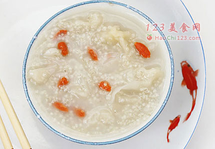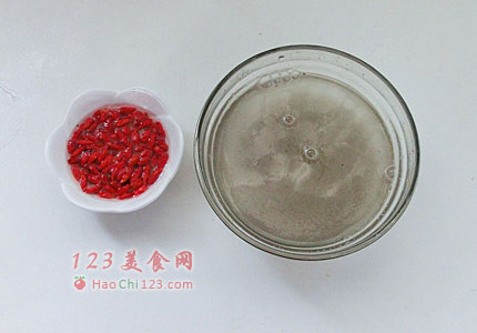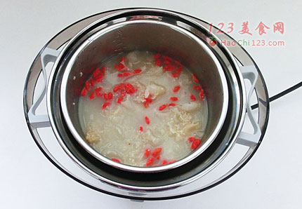 6、加入泡好的枸杞,再小火煮10分钟,关火加盖,焖10分钟即可。