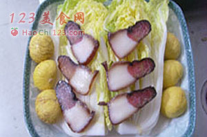 3、放上腊肉片,两边放栗子,适量的盐和鸡精。