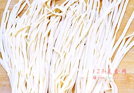 3、把饧好的面团,按扁,用擀面杖擀成薄片,撒上面粉,折叠好,切成粗细均匀的面条。