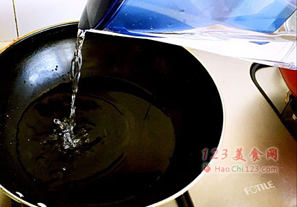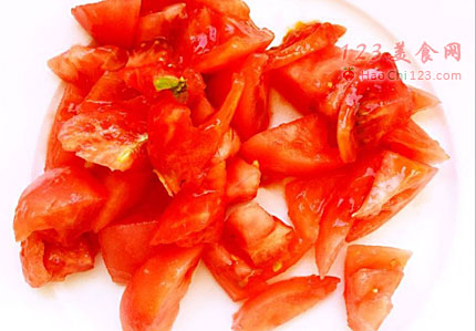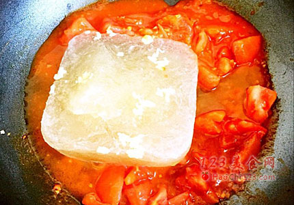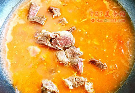 6、放入西红柿块,翻炒出红油,再加适量番茄沙司,翻炒,倒入(牛肉汤)过滤水。