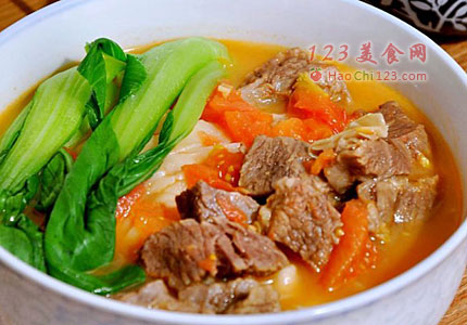 10、放上油菜,浇上做好的西红柿牛肉卤,就可以吃了。
