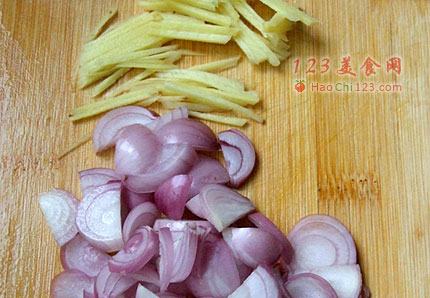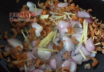 2、起油锅,油热后,下入生姜葱头和海米小火煸炒;葱姜煸炒至微黄卷曲状,香味释放充分,海米在油锅里煸炒,鲜香味道更浓郁。