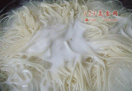 5、做汤卤的同时,可以另起一锅煮面,水沸腾后,下入面条,中火煮开,点凉水,继续煮滚。