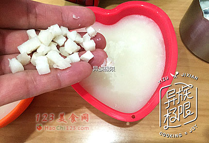 5、想吃Q弹钱葱糕的关键一步是吧浓汁注入锅中,小火再煮至更浓稠,约8分钟左右的样子,期间要不停搅拌;