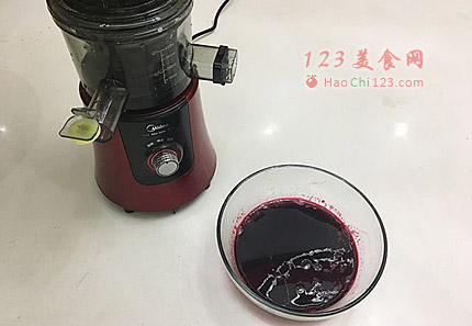 2、甜菜去皮,切块。放美的原汁机中,榨汁。打开出汁口。颜色真的很鲜艳吧!