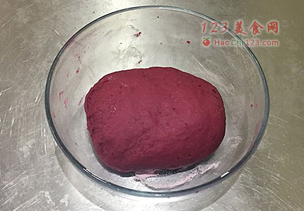 3、甜菜汁中加入酵母粉,搅匀至融化,加入面粉搅拌成絮状。揉成光滑的面团,盖保鲜膜,静置温暖处发酵至2倍大。