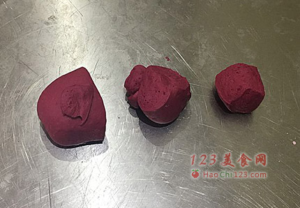 4、将发酵好的面团取出,揉匀。将面团分成三部分,依次是200克,130克,60克(先称出面团总重量,然后再按照3、2、1的比例进行分割,一个比一个大)。