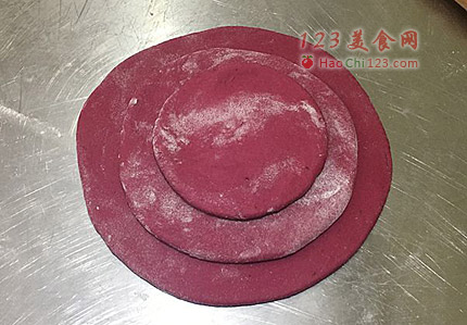 5、将饼擀薄,三个都擀成厚度一样,大小像套娃一样,一个比一个小。