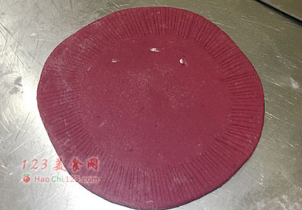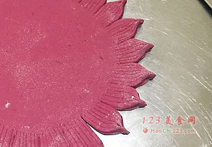 6、边缘部分,用刀压上一圈刀纹,如果像省事,你就找个叉子,在上面依次压上花纹(压的深点,这样发酵后,花纹不会消失,但是记得刀子不要切透切断)。