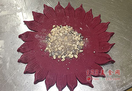 8、中间位置,放上调好的红糖花生馅(记得放中间位置,第二片面饼放上去的时候,不能有漏出来的)。
