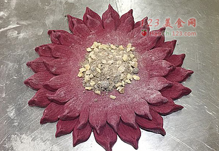 9、第二片面饼和第一片同样方法做造型,然后将其码在上面,用手压实边缘部分。再放红糖馅。