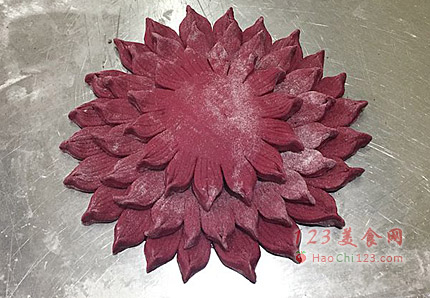 10、最后一片也是同样方法操作,码在最上面,边缘部分压实(这里可以根据你面团的大小,决定摞起来的层次,面团大,你可以多摞几次)。