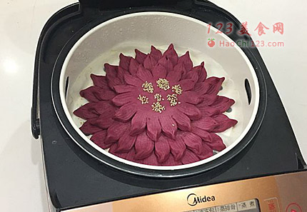 11、蒸篦内铺蒸笼布,将做好的莲花馒头放入,上面粘少许芝麻点缀(蒸篦内铺蒸笼布,记得先在油水混合里面浸湿,不然容易粘连,放进锅子里面不用着急开电饭煲,稍微等会,让它醒发下)。