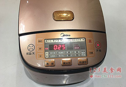 12、开启美的电饭煲,选择蒸排骨程序(我感觉这个馒头个头较大,层次也多,担心不容易熟,所以选择了25分钟的蒸排骨程序)。