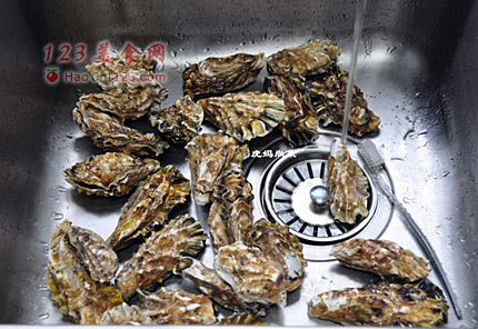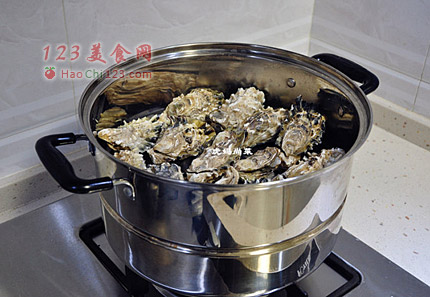 2、将刷洗干净的海蛎子整齐的排入蒸屉上,锅中已经加入了足够的凉水。摆放有讲究,得让海蛎子稳当不倾斜,这样熟了后它会自然开口,里面的鲜汁液也会因为稳固而不外流,吃的时候连汁一起,美到不行。青岛的吃货妞还跟我说,就这个海蛎子里面的鲜汁,可以倒出来炖白菜海蛎子,超美味的。