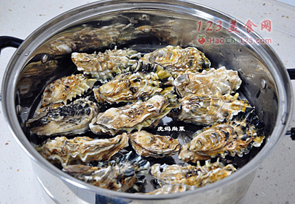 4、焖好后打开锅盖,你会发现海蛎子都微微的张开了口,然后小心的一个个取到盘子中,不要歪斜,以免里面的汤汁流出。这样就可以沿着微开的口轻轻一掰就能打开,然后就吃吧。也有不好掰开的,就用勺子叉子横在中间一撬也就开了。